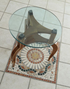 1 - Piccolo Tavolo rotondo (diametro cm. 60, altezza cm. 69) con piano intarsiato tecnica mosaico, rosa dei venti in lastranatura