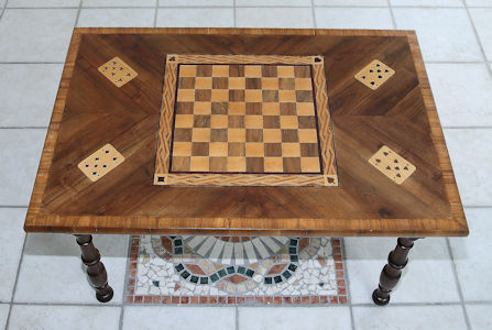 in noce nazionale con incassate quattro carte da ramino, il tutto racchiuso da un bordo in legno di ulivo.